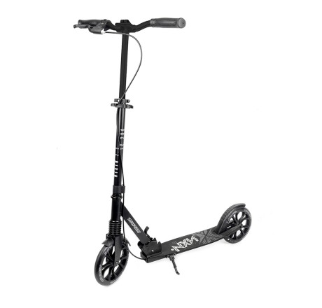 - Hulajnoga oferuje dwa systemy hamowania – ręczny hamulec z regulowaną dźwignią oraz klasyczny hamulec nożny (błotnik tylny).
