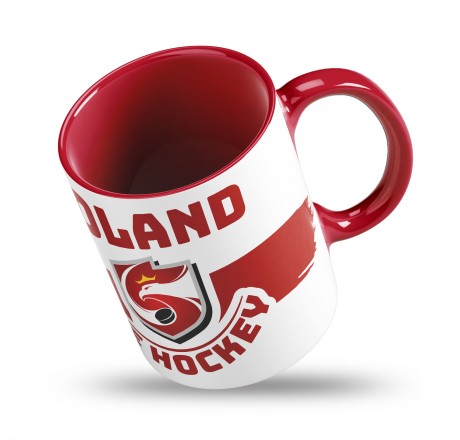 - Kubek utrzymany jest w biało-czerwonej kolorystyce, z wyrazistą grafiką „Poland Hockey” oraz nowoczesnym logotypem.