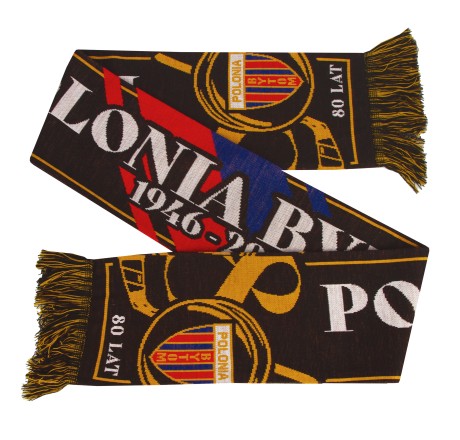 - Elegancki design z motywami rocznicowymi, herbem Polonii Bytom oraz napisem „80 LAT” sprawia, że szal stanowi nie tylko praktyczny element garderoby, ale również cenną pamiątkę dla każdego kibica.
